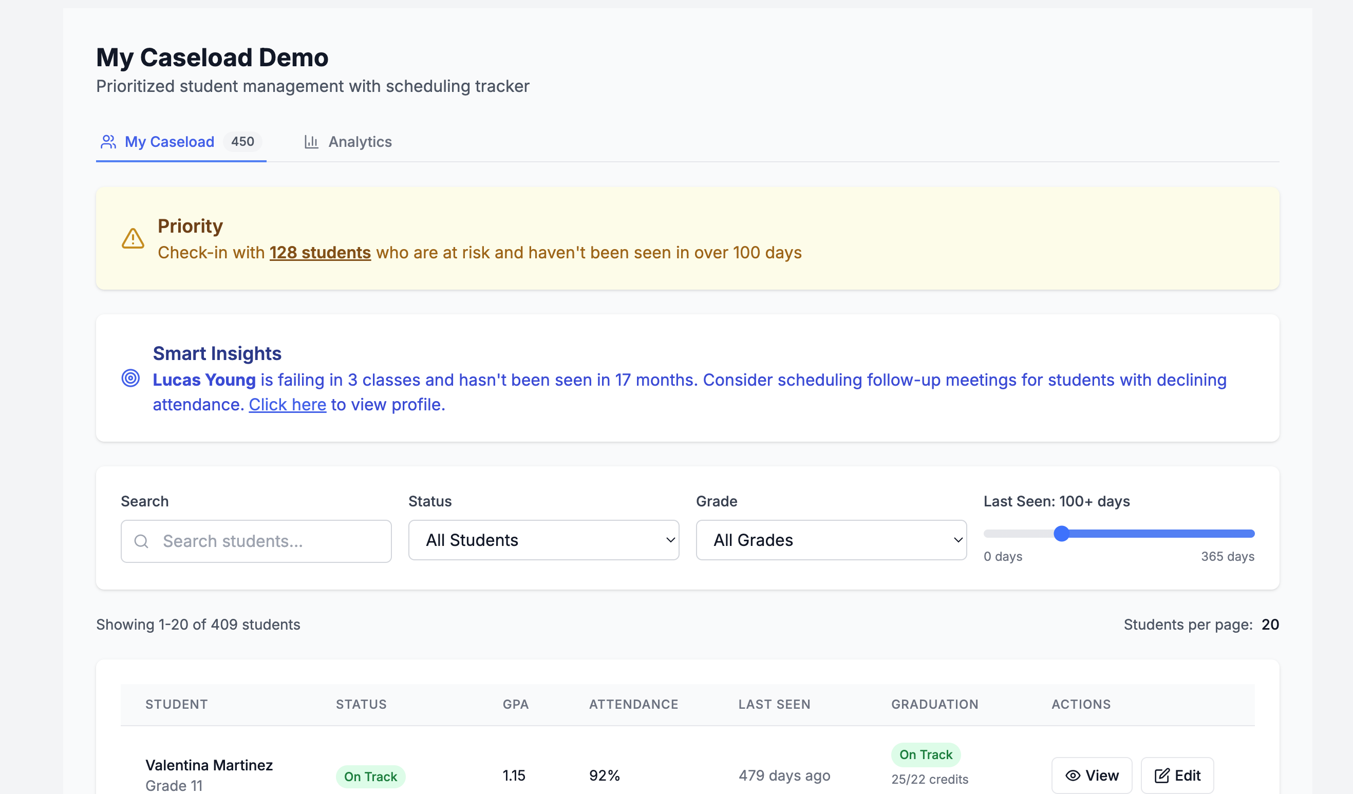 | Manage 300+ student caseload | Spreadsheets and memory, constantly playing catch-up | ✓Smart prioritized dashboard, actionable alerts |